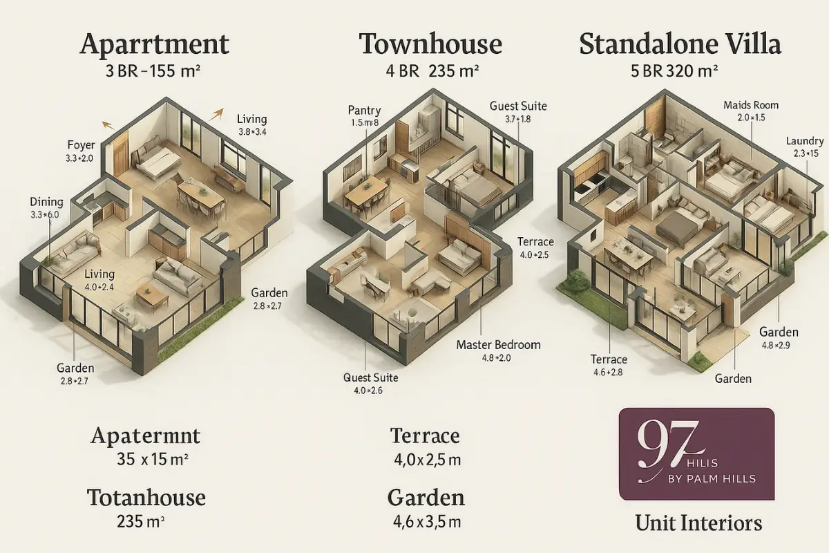 مناسبة للمهنيين والأسر الصغيرة، مع تصميمات تحترم الخصوصية وتقدم مطابخ مفتوحة أو مغلقة بحسب التفضيل، ومساحات تخزين ذكية. الشقة في 97Hills ليست حلا مؤقتا، بل أصل معيشة قابل للتوسع لاحقا عبر الترقية داخل المجتمع نفسه.